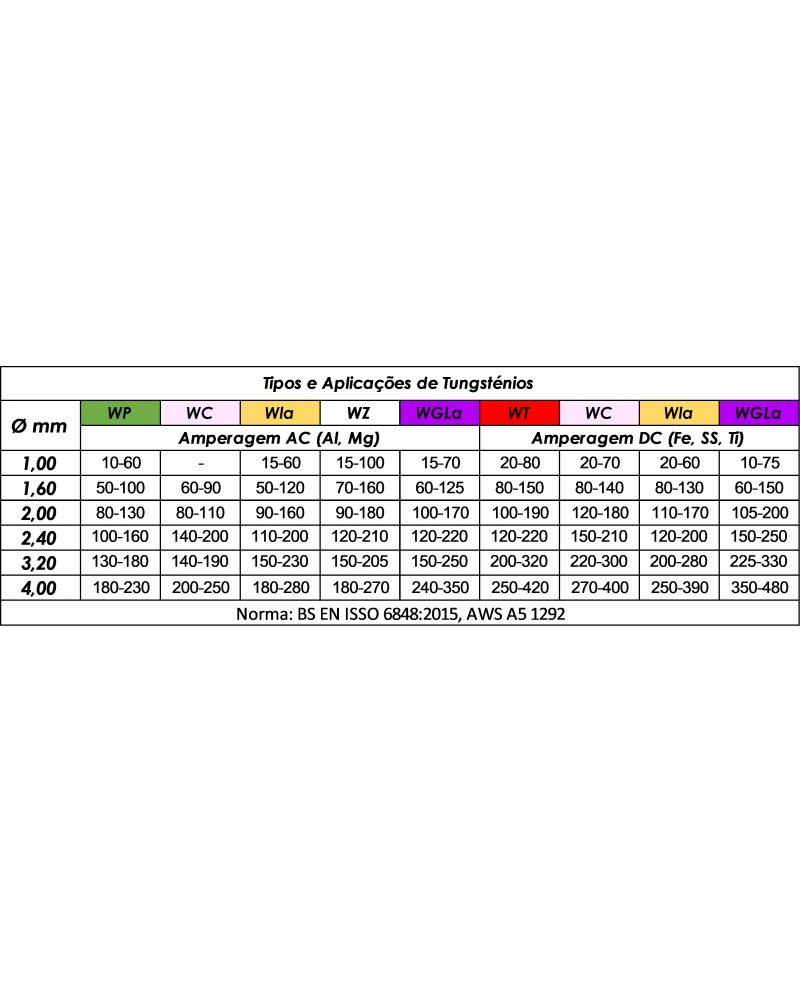 Elétrodo de tungsténio 99,9% de tungsténio (WP). - Aplicação em AC - Alumínio e suas ligas e magnésio. Não aconselhável em DC.