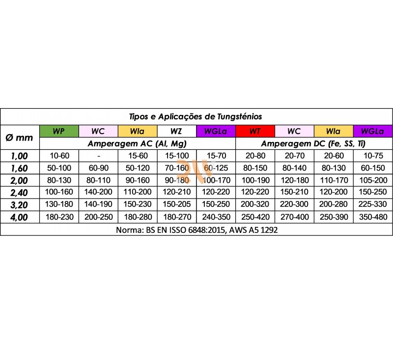 Elétrodo de tungsténio 98% de tungsténio / 2% lantânio (WLa-2). - Aplicação em DC - Aço carbono, inox, níquel e titânio; - Aplicação em AC - Alumínio e suas ligas e magnésio.