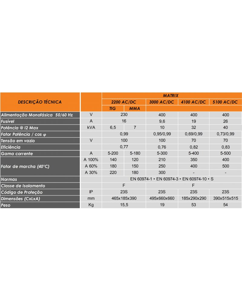 - Equipamentos potentes, práticos, compactos e leves,com geradores monofásicos inovadores, de elevado desempenho e tecnologicamente avançados alguma vez desenvolvidos para a soldadura TIG. O dispositivo PFC (Power Factor Correction) otimiza o consumo energético, permitindo a utiliza¸ão destes potentes geradores, sem problemas, ligados com fusível de 16A e motogeradores. A função avançada e de fácil utilização de controlo digital permite uma perfeita e extraordináriestabilidade dos parâmetros de soldadura, garantindo, assim, uma soldadura TIG e MMA com características de elevada qualidade com quaisquer elétrodos. A série MATRIX 2200 AC/DC é a escolha ideal para todas as aplica&ccdil;ões de soldadura e trabalhos de manutenção, sempre que seja necessária potência e portabilidade. São adequados para a soldadura TIG de todos os metais e alumínio, incluindo as suas ligas.