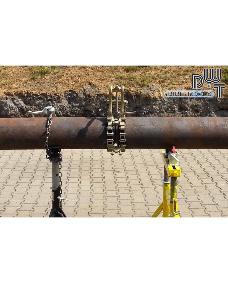 Duplo alinhador de tubo de corrente em aço com faixa de 203-508mm. Ao remover a corrente, os elos e as barras de apoio da corrente ajustam-se aos vários diâmetros de tubo.